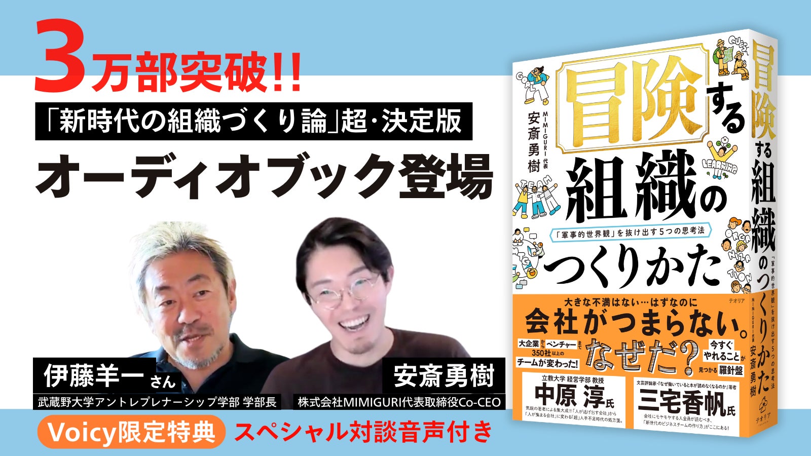 今回のオーディオブック化に際し、Voicy限定特典として、伊藤羊一さん(武蔵野大学アントレプレナーシップ学部 学部長)と著者・安斎勇樹によるスペシャル対談音声を収録。刊行当初から本書を推薦してくださっていた伊藤さんをゲストに迎え、「冒険する組織」についてたっぷり語っていただきました。