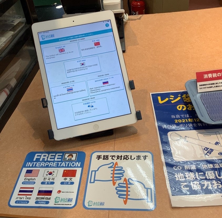 「みえる通訳」は、タブレットやスマートフォンを使って、いつでもどこでもワンタッチで、通訳オペレーターにつながり、お客様との接客をサポートする映像通訳サービスです。日本語と外国語が話せる専門の通訳オペレーターとFace to Faceでお互いの顔や表情を見ることで、微妙なニュアンスや機械では判別できない難しい内容でも会話することができます。
