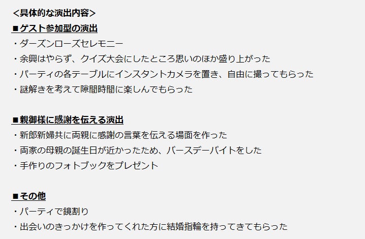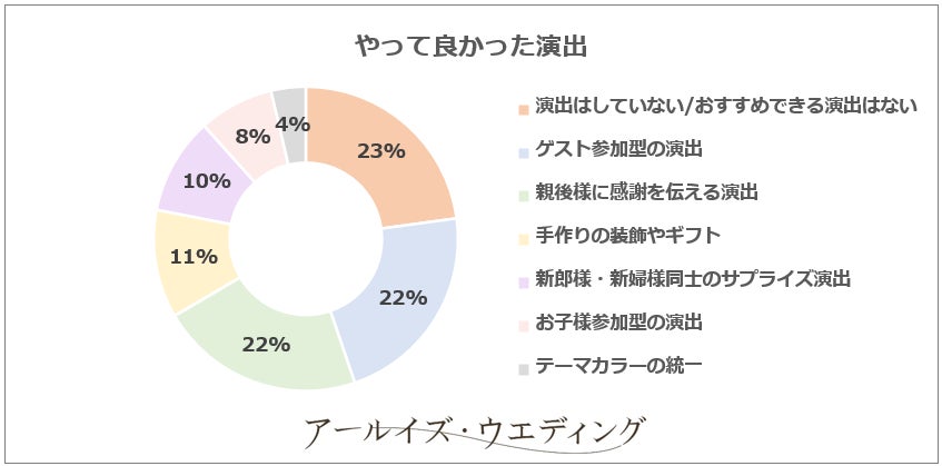 一方、やってよかった演出として多かった回答は「ゲスト参加型の演出」と「親御様に感謝を伝える演出」でした。結婚式のこだわりポイントでもゲストへのおもてなしを重要視する方が多いことから、自分たちだけではなく、ゲストにも楽しんでもらえる演出の満足度が高くなりました。