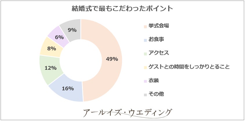 約半数の方が「挙式会場選び」を最もこだわったと回答。次いで、「お食事」「アクセス」とゲストへのおもてなしを重視する方が多いことがわかります。