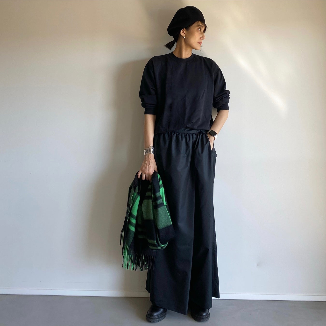 たっぷりとしたワイドシルエットの中に、真冬は厚手タイツやレギンスを仕込んでも、外に響か