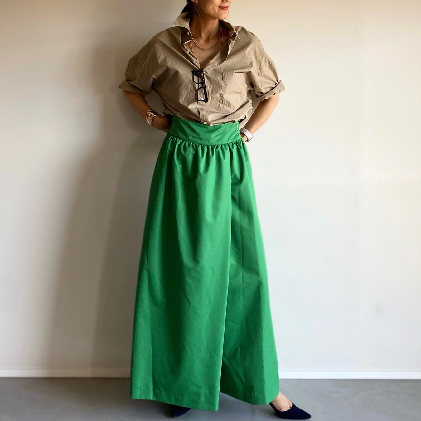 フロントはパッと見た時にマキシスカートのように見えるラップ仕様だから、パンツが苦手なスカート派の方にもおすすめです。