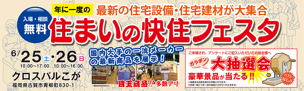 株式会社デンヒチ 福岡東営業所(福岡県古賀市 / 本社:北九州市八幡西区 / 代表取締役社長:吉田信一郎)は、2022年6月25日(土)・26日(日)の2日間、クロスパル古賀にて『住まいの快住フェスタ』を2年ぶりに開催いたします。
