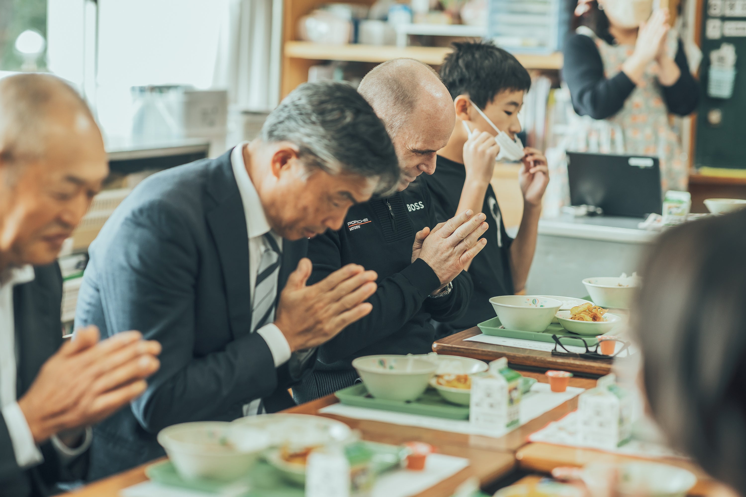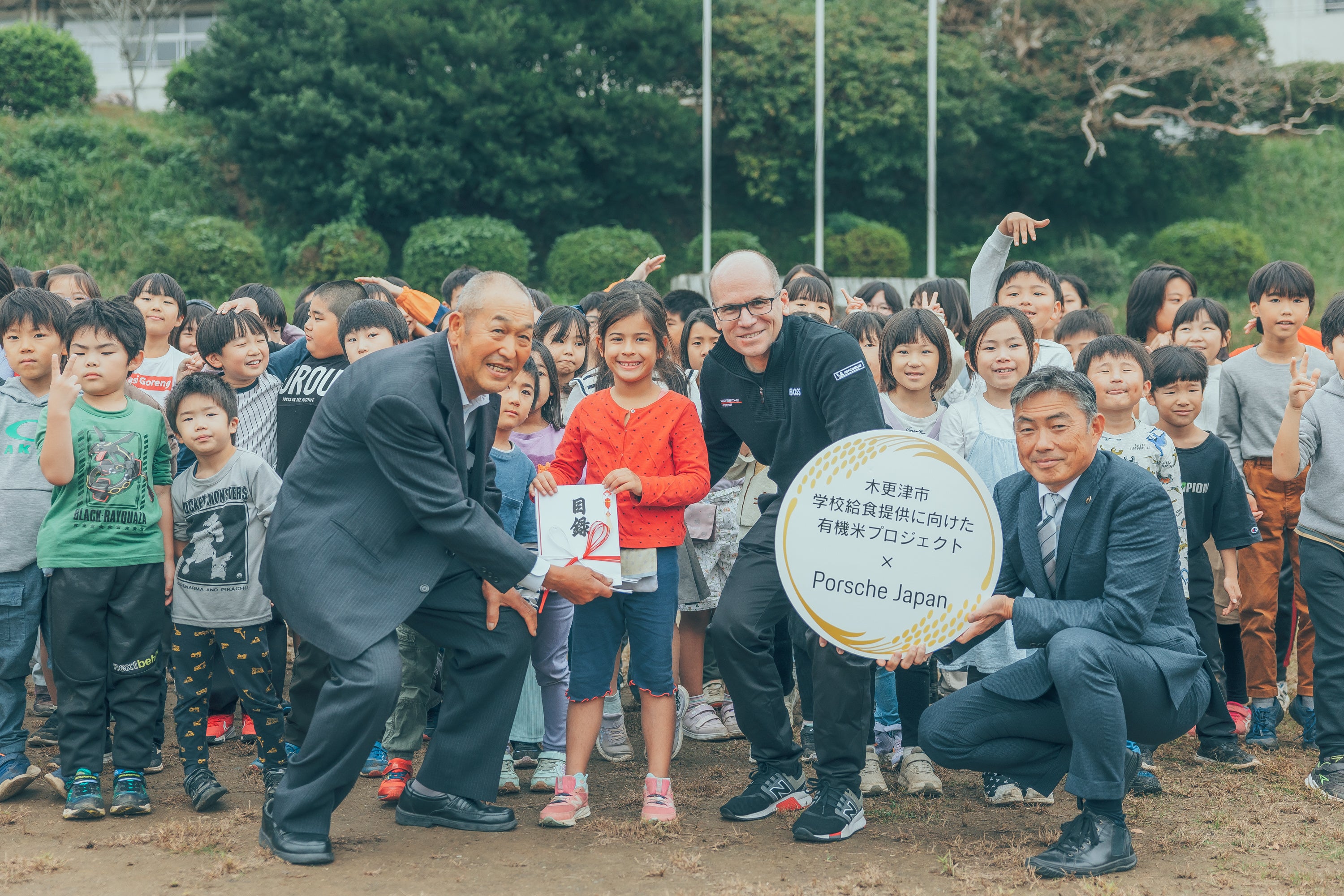 また、今年で6年目となる木更津「学校給食提供に向けた有機米プロジェクト」にも寄付を実施し、ポルシェジャパン社長のフィリップ・フォン・ヴィッツェンドルフが木更津市鎌足小学校の給食試食会に招かれました。御礼として、ポルシェの最新モデル新型タイカンクロスツーリスモと911 GTSを昼休みに校庭で披露し、生徒たちとの交流を楽しみました。米作りを取り巻く環境は、農業従事者の高齢化や担い手不足、耕作放棄地の増加や有害鳥獣被害の深刻化など、厳しい状況にある中、木更津市では、化学農薬・化学肥料を使わずに栽培したお米を市内公立小中学校に提供する、地産地消と食育の推進を行っています。ポルシェジャパンはPEC東京がオープンする前の2021年からこの活動に賛同し、寄付を継続しています。PEC東京では、この希少価値の高い木更津市の有機米を使用したメニューを、レストラン906と956カフェで提供しています。