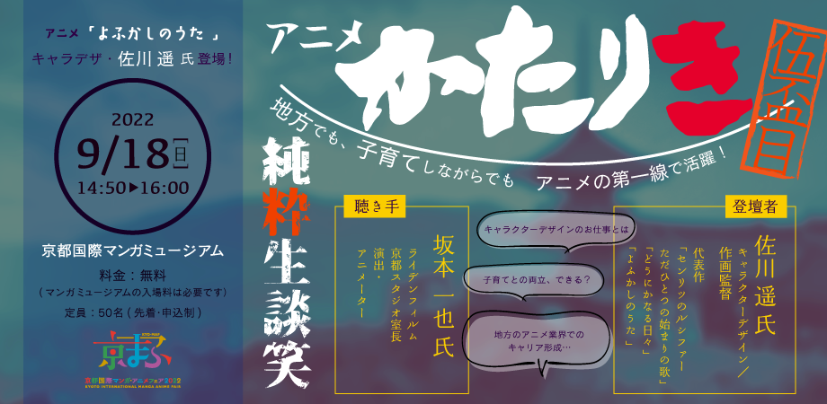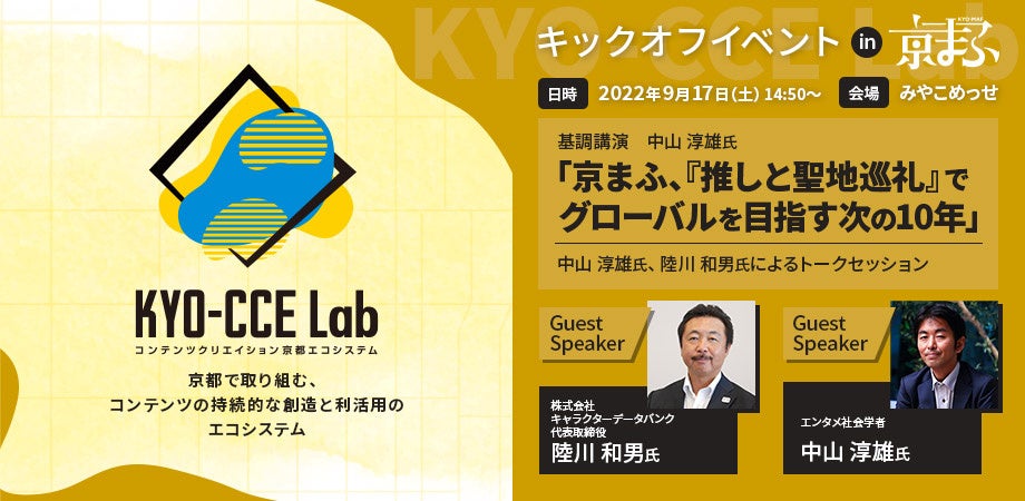 株式会社ツクリエ(本社:東京都千代田区 代表取締役:鈴木英樹 以下、ツクリエ)は、京都市より運営受託をするコンテンツクリエイション京都エコシステム基盤構築事業の一環で、京都国際マンガ・アニメフェア(以下、京まふ)2022の連携企画として、エンタメ社会学者として活躍する中山淳雄氏とキャラクターデータバンク代表・陸川和男氏によるビジネスセミナーを開催します。