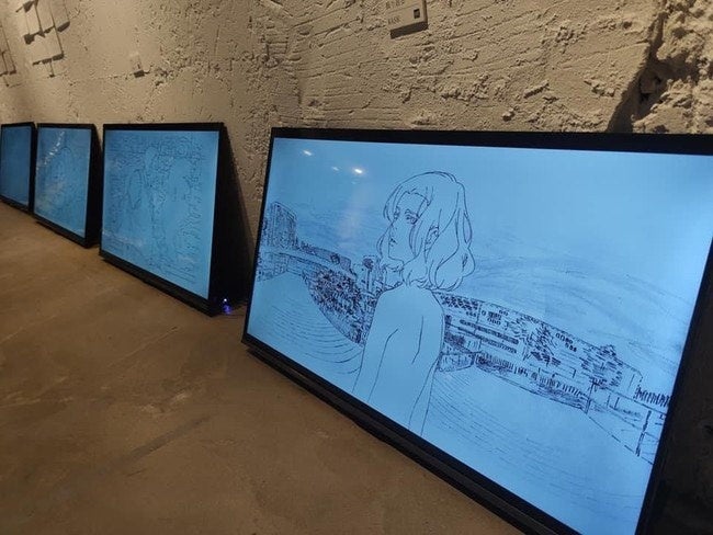 12月22日・23日の出展の際は、郷津氏が手がけた作品の展示、コレボレーション作品を製作しているバッグなどが展示されました。また、映画やアニメが分散化されることでどのような未来が期待されるのかなどをテーマに、有識者を招いて対談も行われました。明日の出展では対談の予定は現時点ではありませんが、22日・23日に展示したものと同様のアニメーション作品や原画などが展示される予定です。