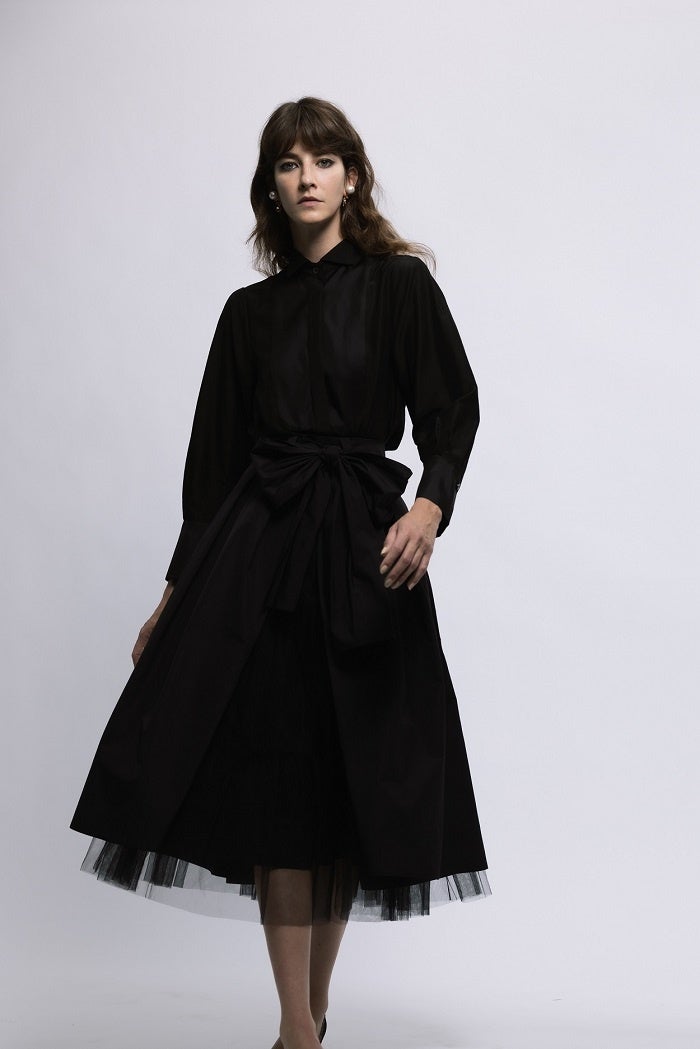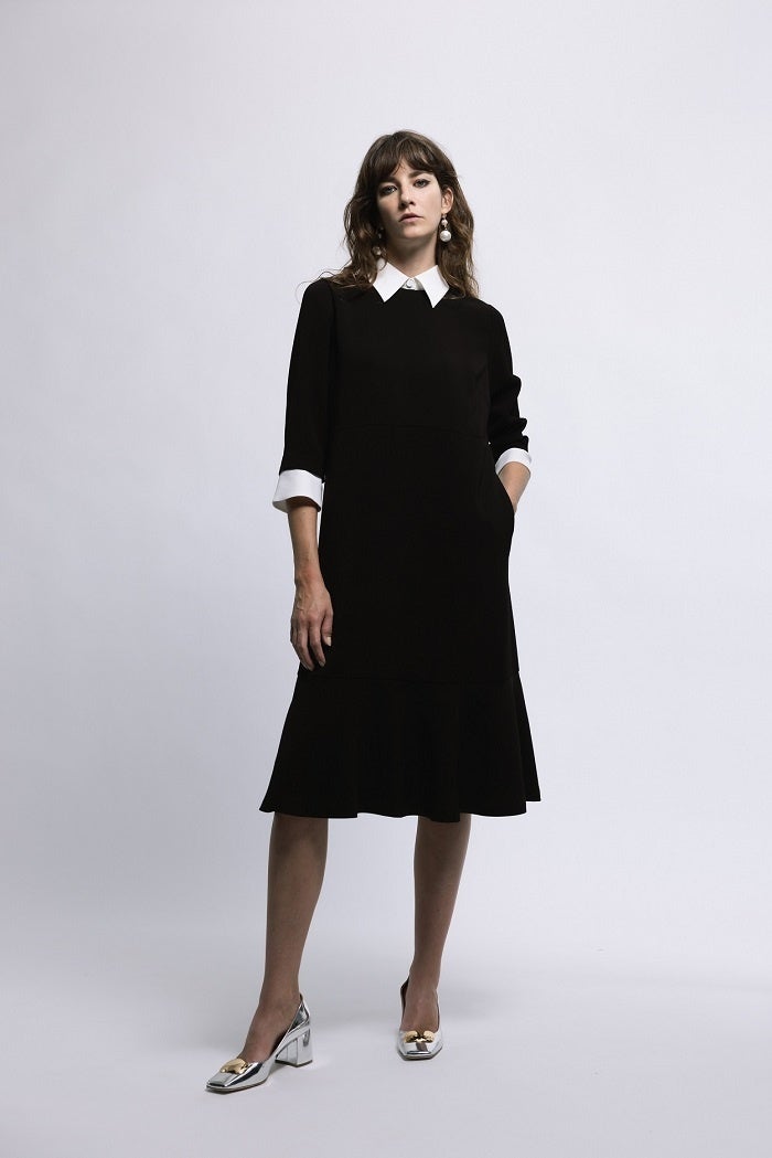商品詳細:トリアセダブルクロス素材を使用した、ボディラインを美しく見せるシルエットに拘ったドレス。カラー、カフス、ボウタイが取り外し可能。