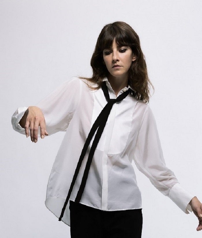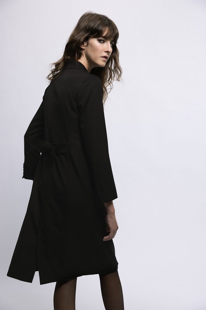 商品詳細:細番手の薄手で上質感のあるウール地を使用したスモーキングスタイルのドレス。パンツと合わせてロングジャケットのように羽織ることも可能。