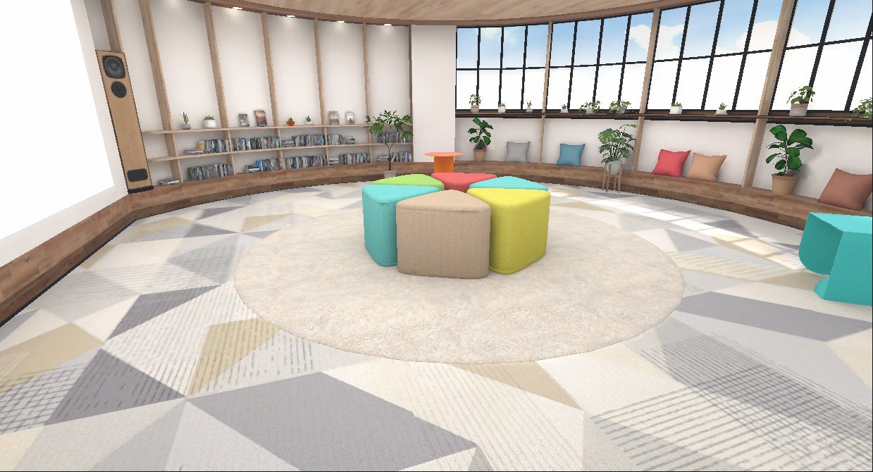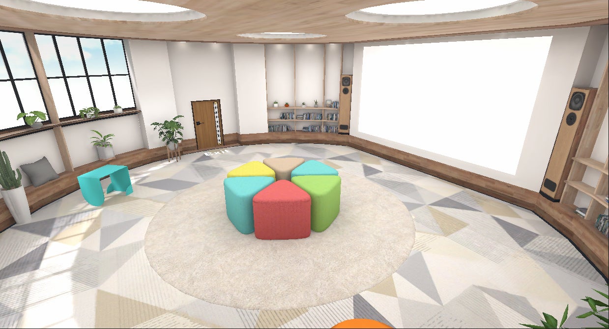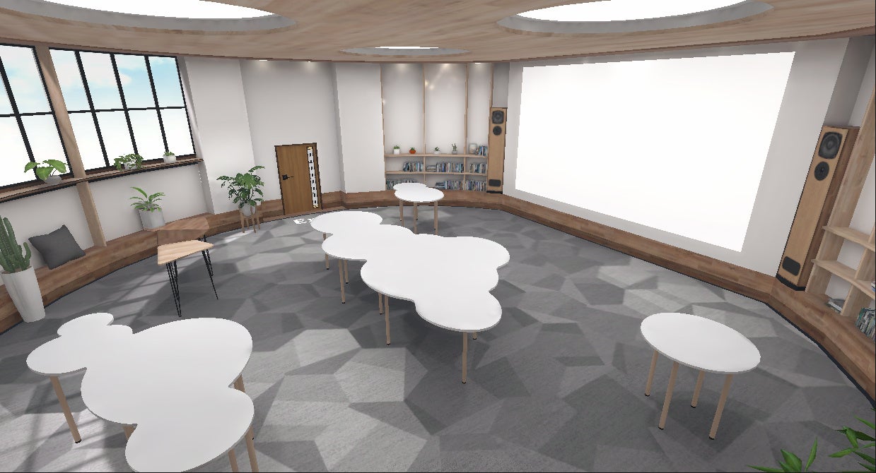 動画を流すためのメインスクリーンをはじめ、情報発信コーナー、チャット掲示板、360°動画など各コーナーを配置しています。
