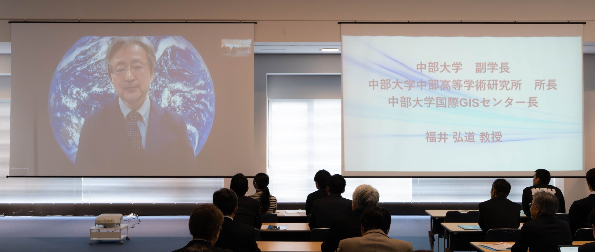 事業説明の前には、中部大学 福井 副学長(愛知県春日井市)がオンラインで登壇、南海トラフ地震に備え名古屋空港を拠点とする「国際災害支援基地構想」についての説明がされました。