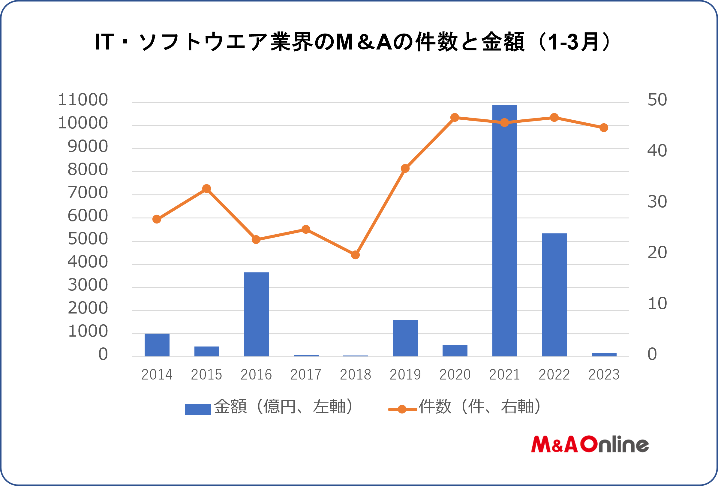 2023年1-3月のIT・ソフトウエア業界のM&A件数は高水準も金額は下位から3番目
