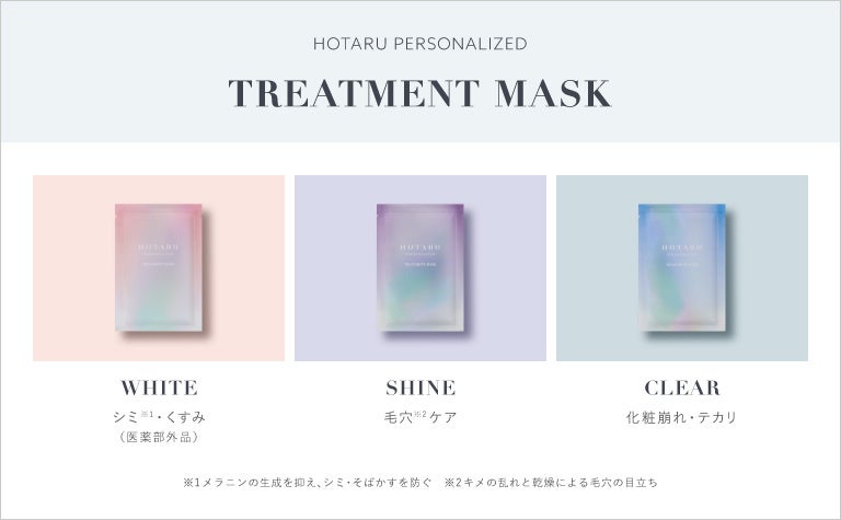 このたび、HOTARU PERSONALIZEDのローション&モイスチャライザーと併せて使用することで、肌悩みの集中ケアで美肌を叶えるフェイスパック「HOTARU PERSONALIZED TREATMENT MASK」1セット(3枚入り)を定期コース2,940円(税込・送料込)にて発売いたします。現在提供しているローション&モイスチャライザーは、肌悩みにダイレクトにアプローチする成分として、たるみ毛穴*1に働きかけるパルミトイルトリペプチド-5*2や、乾燥によるキメの乱れに働きかけるバクチオール*3などを一人ひとりの肌悩みによって配合*4しております。本マスクは、“肌悩みを集中ケアする”ことを目的とし、キー成分を配合した美容液を浸透させたコットン製の顔用マスクです。3枚で1セットとなっており、医薬部外品でシミ*5・くすみ解消に特化した「WHITE」、毛穴ケアに特化した「SHINE」、化粧崩れ・テカリ解消に特化した「CLEAR」の3タイプから自分にぴったりのマスクを選択することが可能です。使用の際は、ローション、トリートメントマスク、セラム、モイスチャライザー、アイクリームの順番で塗布することを推奨いたします。