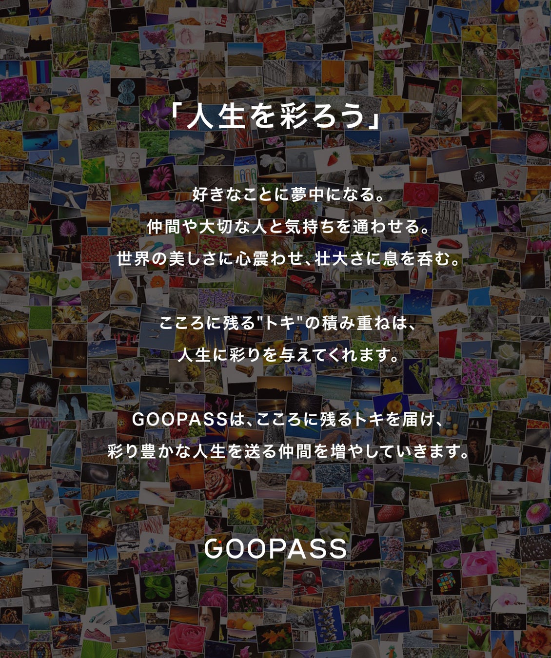 これからの私たちは、笑顔になれる瞬間をもっと増やしたいと考えています。GOOPASSのネーミングにはいくつかの由来がありますが、社名変更を契機に「人生を彩る通行証(Good pass)」として再定義をしました。今まで以上に、クリエイター、地域、事業会社など様々なパートナーと連携させていただき、一人ひとりがこころに残る‟トキ”を過ごすための手段やきっかけを提供し、社会に人生を彩る仲間を増やしていきます。