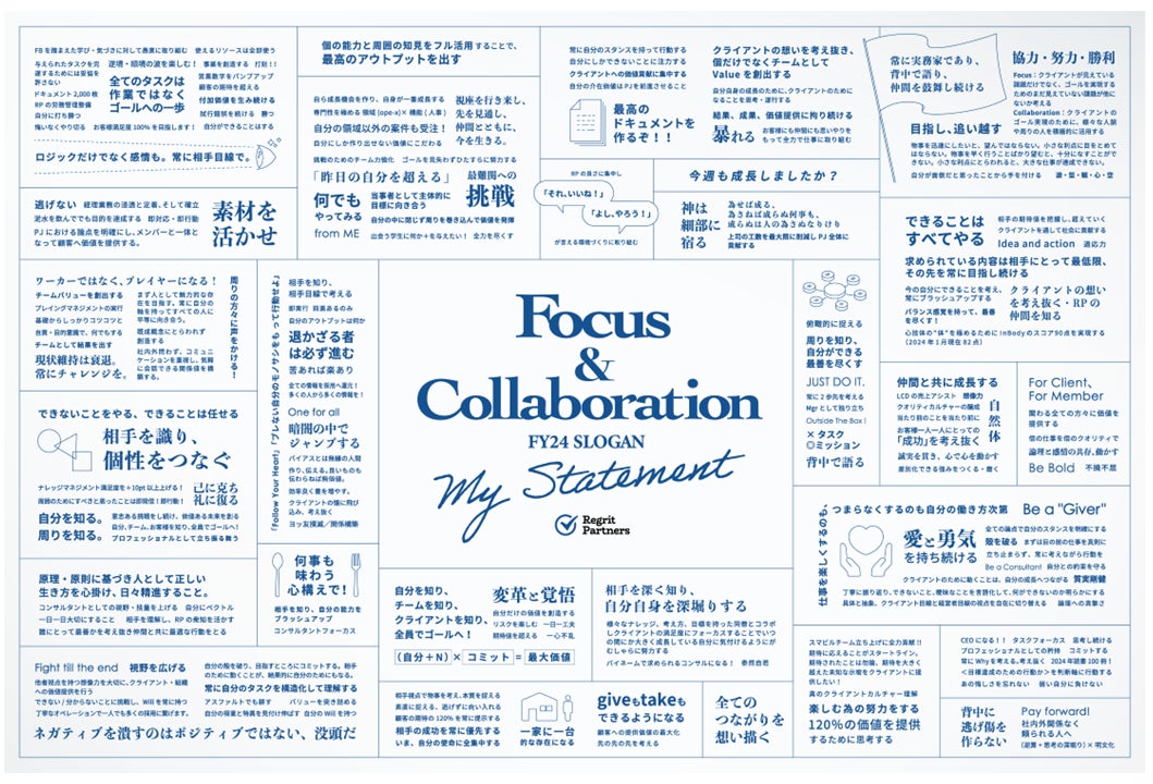 組織の年間スローガンとして「Focus & Collaboration」を設定し、事業目標の達成に向けた指針としました。このスローガンを組織全体に浸透させるため、社員全員が心がける行動を集約したステートメントパネルを作成し、オフィスへ設置。スローガンを「自分ごと」として社員一人ひとりが意識しやすくなり、その理念を日常業務に根付かせる象徴的な役割を果たしました。 -