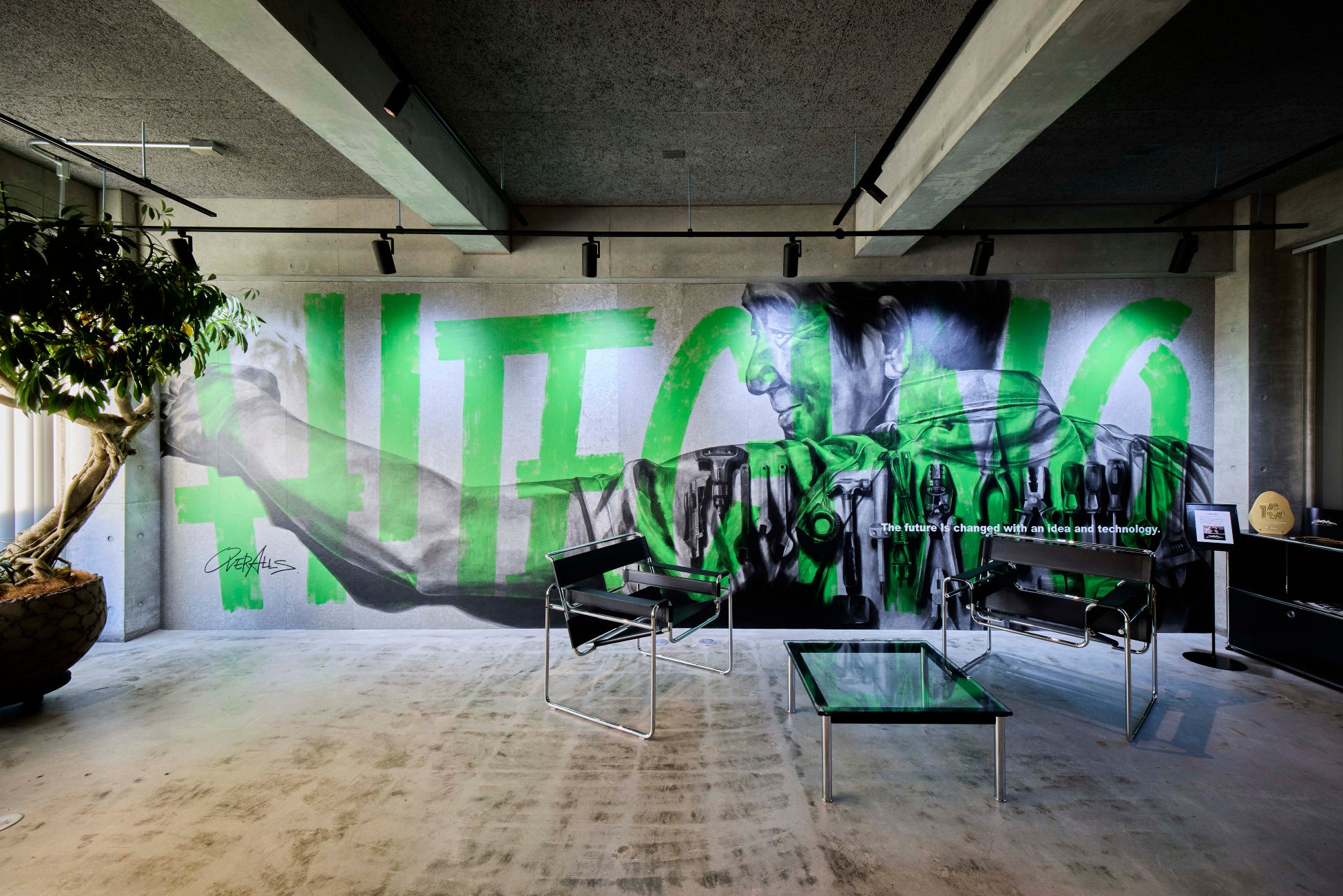 壁画の中の先代が着用しているポロシャツは、当時ハイテクノの制服として毎日のように身に着けていたもの。その背中には、創業期をともに歩んだ工具を落とし込み、同社の歴史を象徴するモチーフとしています。まなざしからは、まるで声が聞こえてくるかのような温かさと力強さが感じられ、創業の原点に立ち返らせてくれる存在となっています。