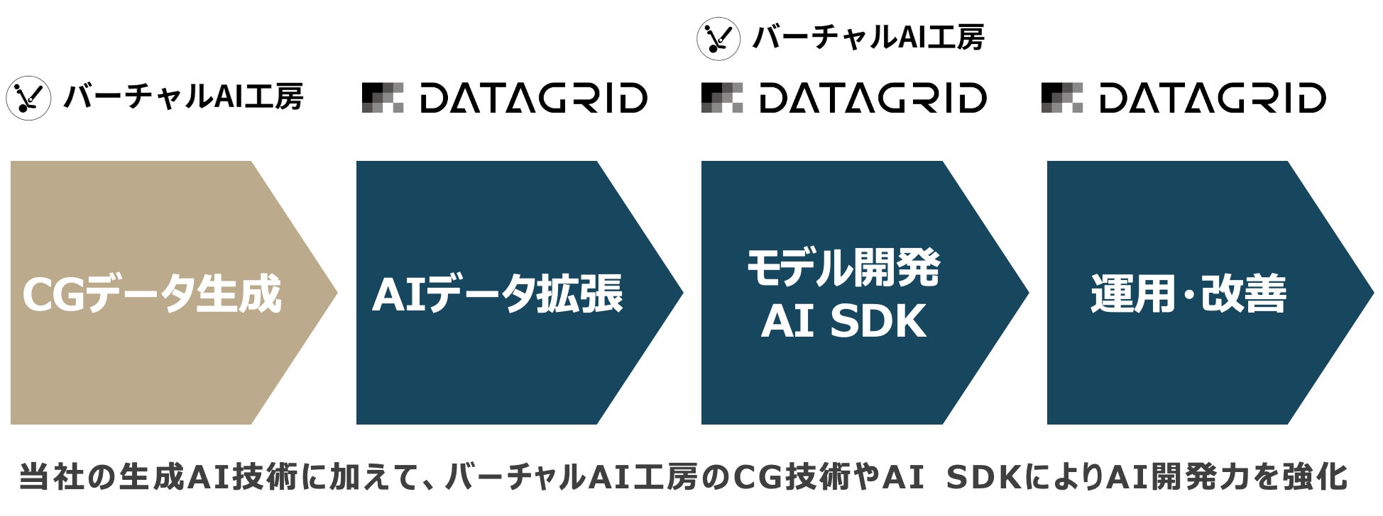 今回の吸収合併により、データグリッドはこれまで開発してきた生成AI技術に加えて、バーチャルAI工房が有するCG技術とAI SDKを組み合わせることで、AIによる画像認識分野における、データ生成からデータ拡張、AI開発まで一気通貫のソリューション提供が可能となります。すでに複数の顧客企業での実証実験を実施し、短期間での高品質なAI実装を実現できることを検証しています。