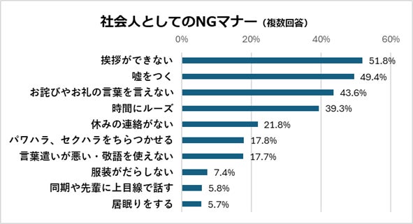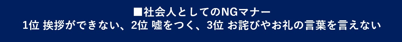 「社会人としてやってはいけないと思うマナー違反」は、「挨拶ができない」(51.8%)、「嘘をつく」(49.4%)、「お詫びやお礼の言葉を言えない」(43.6%)、「時間にルーズ」(39.3%)、「休みの連絡がない」(21.8%)までが上位5つでした。