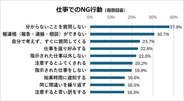 「新入社員が仕事をするうえで、これだけはやめたほうがいいと思う行動」について、最も多かったのは「分からないことを質問しない」(37.9%)。