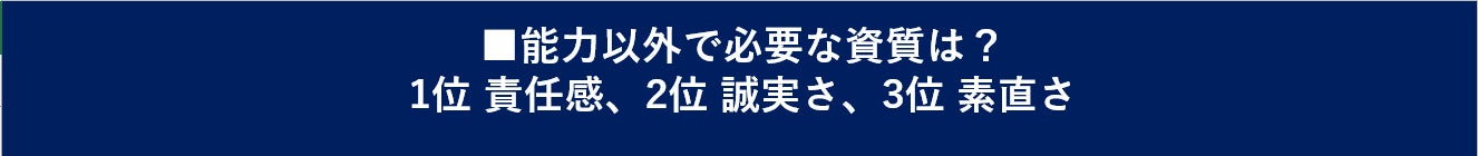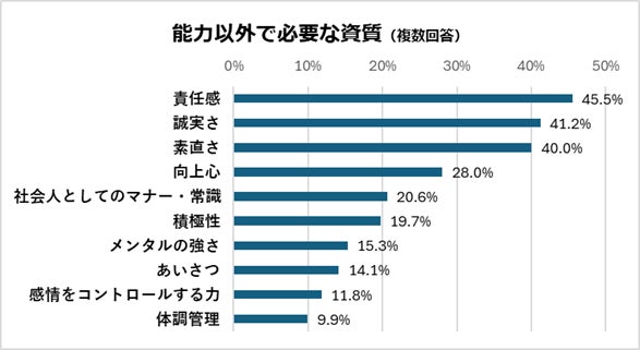 仕事で直接必要になる能力以外で必要な資質については、「責任感」(45.5%)、「誠実さ」(41.2%)、「素直さ」(40.0%)がトップ3。