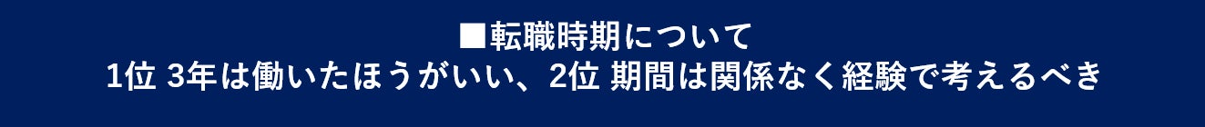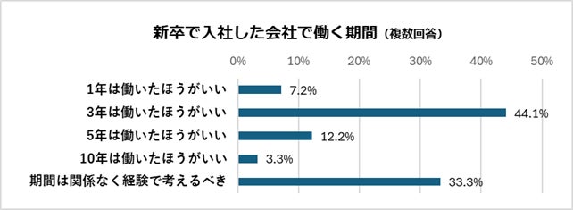 「新卒で入社した会社ではどのくらい働いたほうがいいと思うか」も聞きました。最も多いのは「3年は働いたほうがいい」(44.1%)で、次に多かったのは「期間ではなく経験で考えるべき」(33.3%)でした。3年という期間については「最初の1年はとりあえずやってみる、2年目は良いやり方を考えてトライ&エラーをやってみる、3年目で見極められる」というように、3年あれば仕事を覚えたり、適性を見極められたりできるという意見が多くありました。