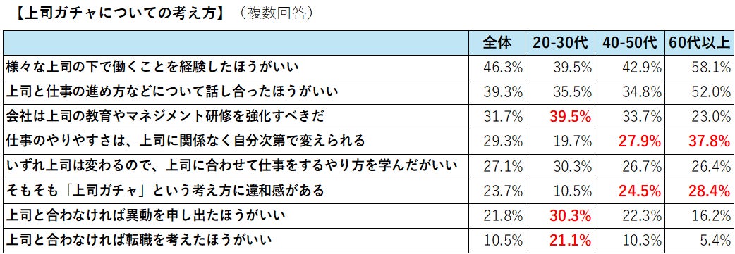 反対に40代以上が高かったのは「仕事のやりやすさは、上司に関係なく自分次第で変えられる」(20-30代=19.7%、40-50代=27.9%、60代以上=37.8%)と「そもそも上司ガチャという考え方に違和感がある」(20-30代=10.5%、40-50代=24.5%、60代以上=28.4%)でした。