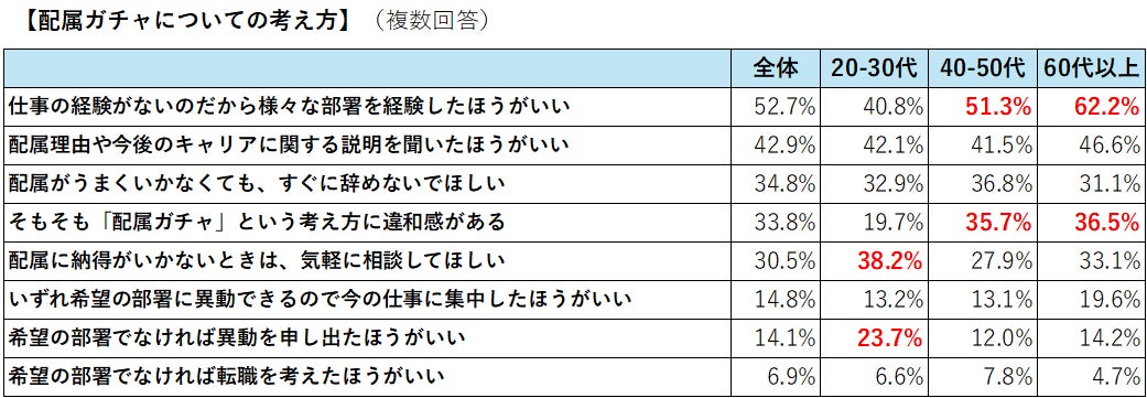 年代別に「20ー30代」「40-50代」「60代以上」で比較すると、「20ー30代」が高いのは「配属に納得がいかないときは、気軽に相談してほしい」(20-30代=38.2%、40-50代=27.9%、60代以上=33.1%)、「希望の部署でなければ異動を申し出たほうがいい」(20-30代=23.7%、40-50代=12.0%、60代以上=14.2%)の2つ。
