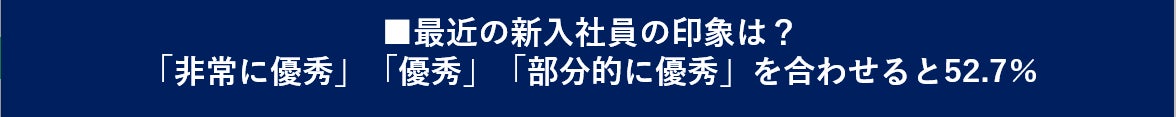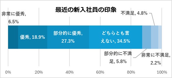 新入社員の仕事ぶりについて聞いたところ、最も多かったのは「どちらとも言えない」(34.5%)でしたが、「非常に優秀」(6.5%)、「優秀」(18.9%)、「部分的に優秀」(27.3%)と合わせると52.7%と、仕事で一定の評価を与えている人が過半数になりました。