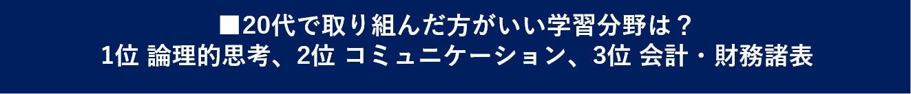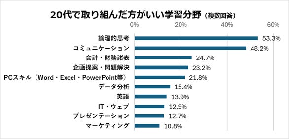 20代で取り組んだほうがいい学習分野については、最も多かったのは「論理的思考」(53.3%)でした。論理的思考が必要な理由について「若いうちに論理的思考の習慣を身に付けておかないと、独りよがりや行き当たりばったりの対応に陥るから」「論理的思考は、勉強すれば身に付けられる。身に付いているといないとでは、5年後、10年後のキャリアに差が出る」「論理的思考はマネジメントに不可欠。持っていないとリーダーとしての資質に欠ける」といった声が寄せられました。