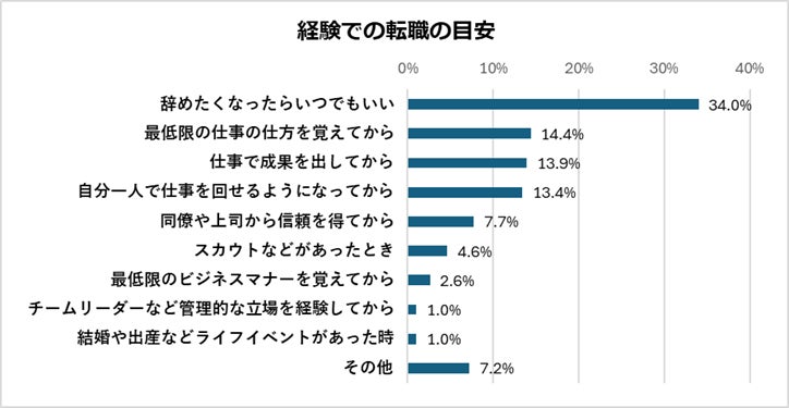 期間ではなく経験での転職の目安として最も多いのは「辞めたくなったらいつでもいい」(34.0%)で、続いて「最低限の仕事の仕方を覚えてから」(14.4%)、「仕事で成果を出してから」(13.9%)、「自分一人で仕事を回せるようになってから」(13.4%)がほぼ同数で並びました。