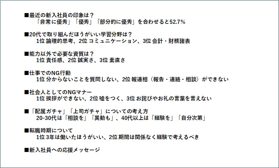 取り組むべき学習分野、能力以外で必要なもの、仕事でのNG行動、配属ガチャ、転職時期、応援メッセージなど