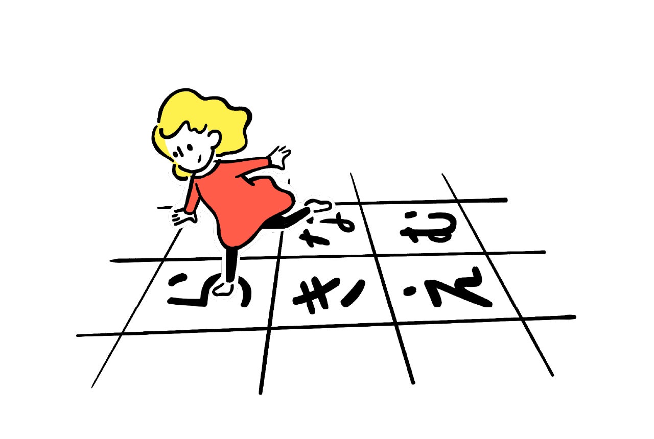 これは何の絵? 床に並んだたくさんのひらがなの中に、モノや生きものの名前が隠れてる。体を動かして隠れた文字をみつけよう!