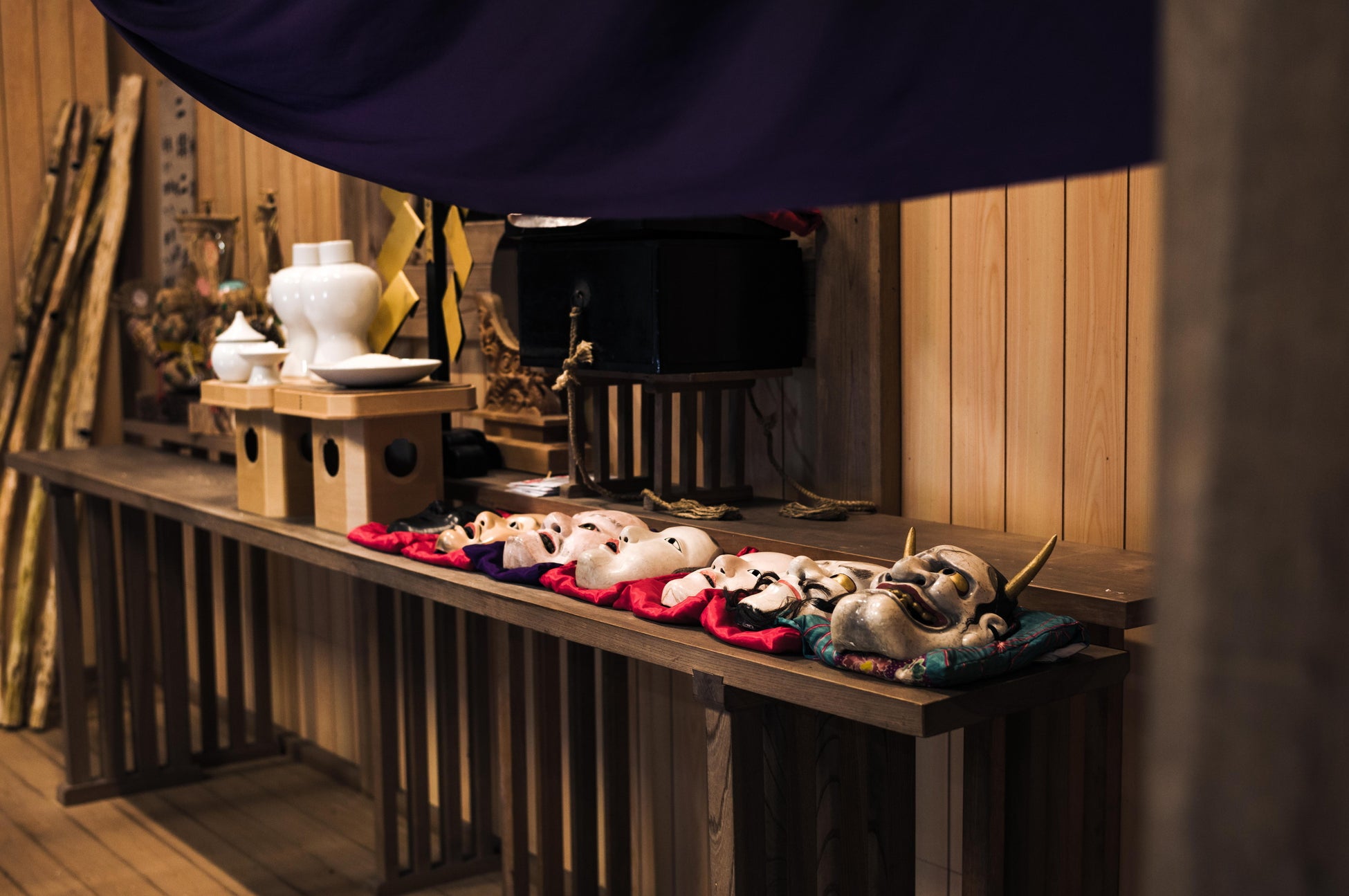 2月15日午後5時、「おめでとうございます」の声で奉納神事がすべて終了すると、神面などの諸道具が神主らの手によって、一つひとつ丁寧にしまわれます。