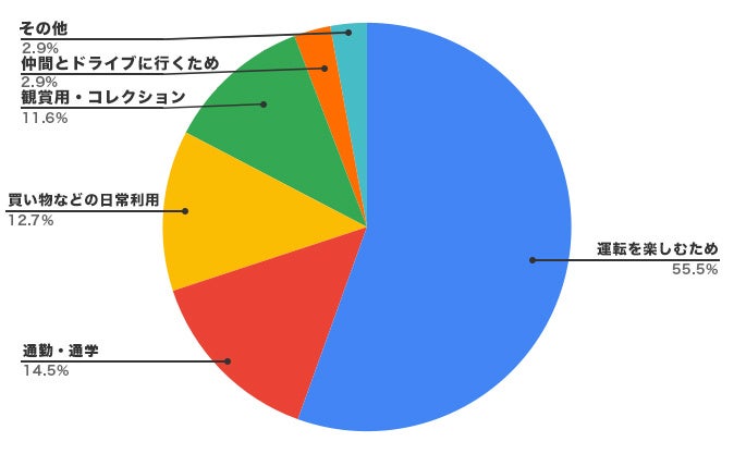 また、「観賞用・コレクション」と回答したユーザーが1割以上いることから、車を走らせる意外の目的で所有しているユーザーも一定数いることがわかりました。