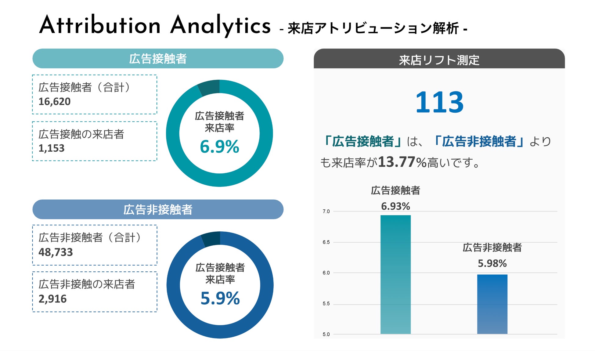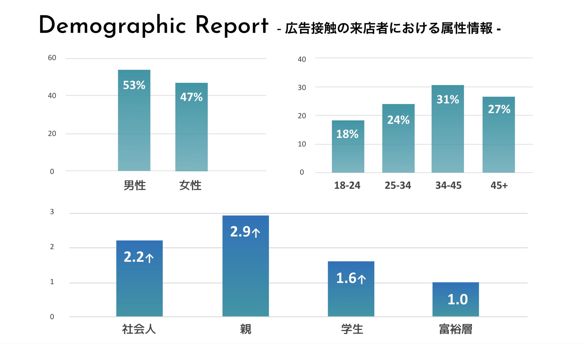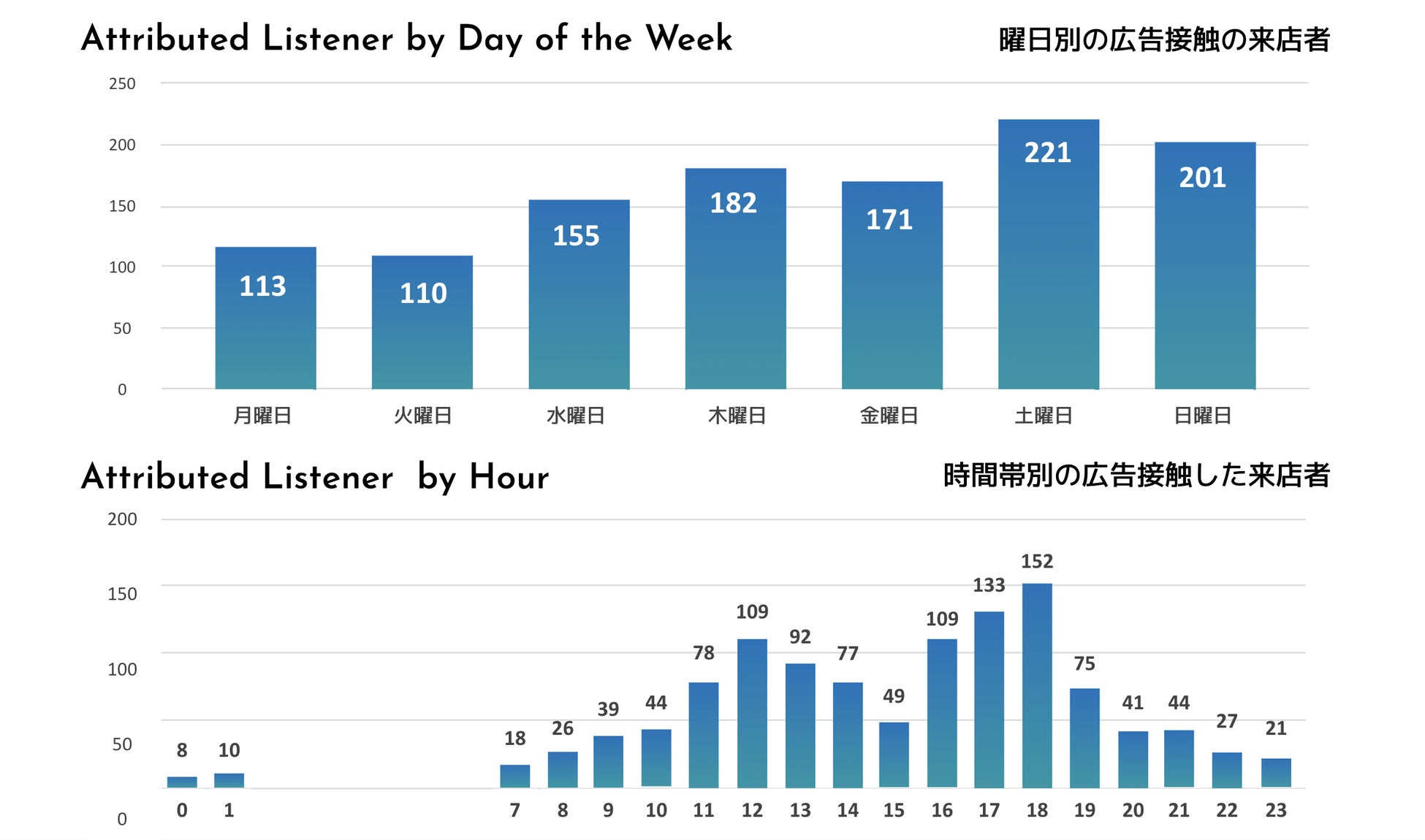 ラジオ局の持つデータを活用することで、出稿のボリュームに合わせて広告接触者における性別や年齢、来店率などを記載したラジオ広告のレポーティングが可能です。