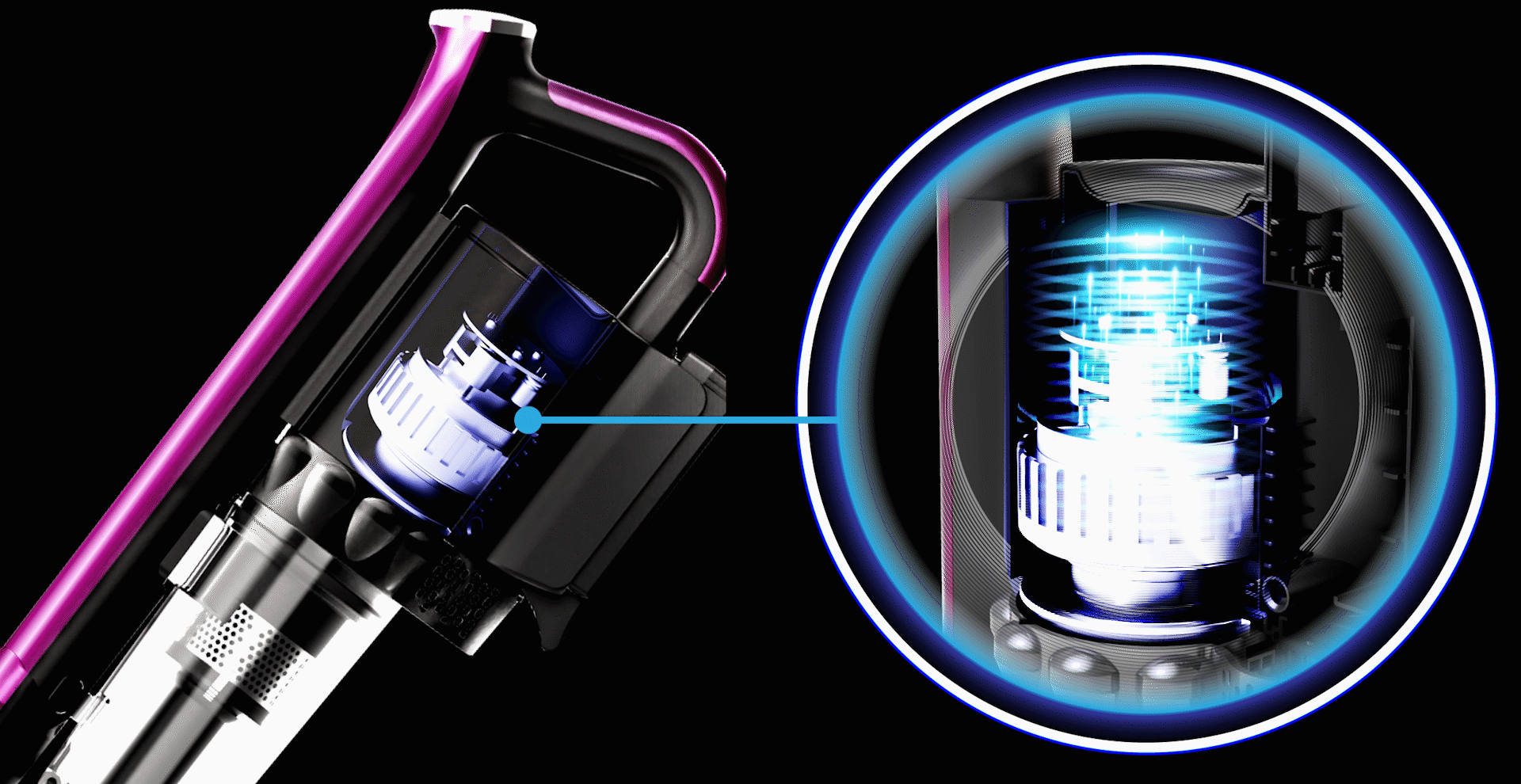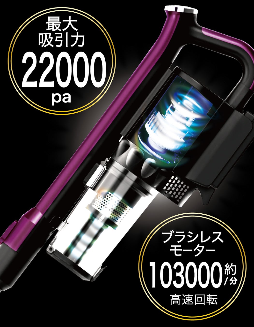 今回採用したブレスレスモーターは1分間で約103000回の高速回転をすることで、最大22000paもの高吸引力を実現しました。
