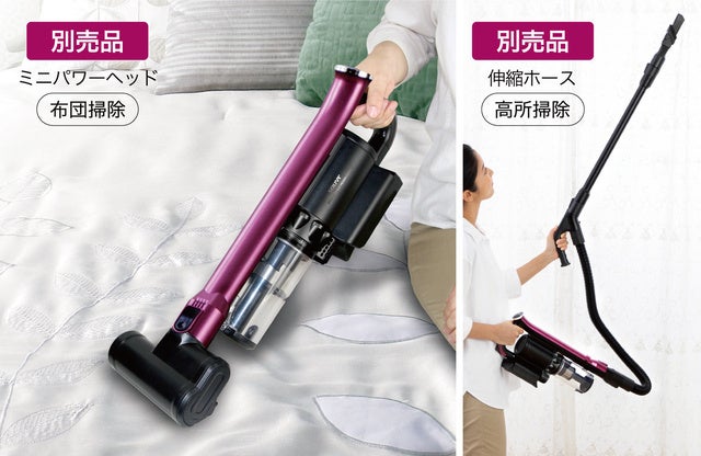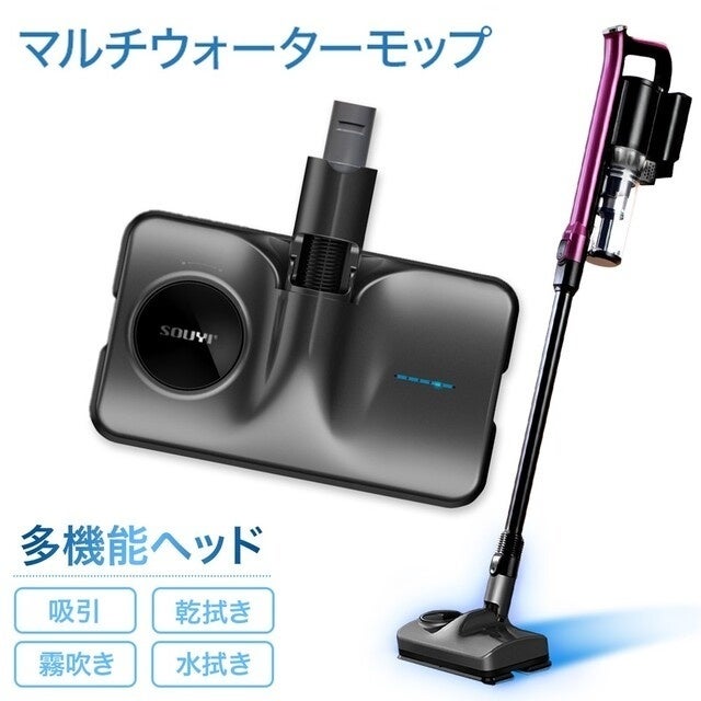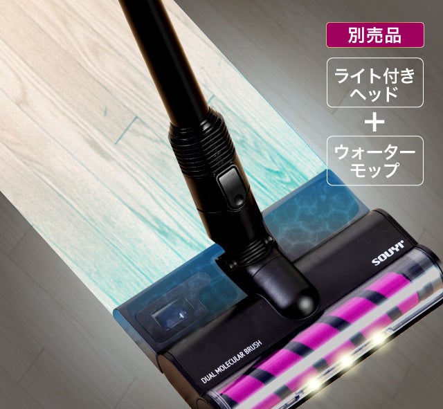 家具の下など暗く狭い場所で大活躍のLEDヘッドライトが付いた掃除機ヘッドと、吸引と同時に床の水拭きをすることができる着脱式ウォーターモップです。