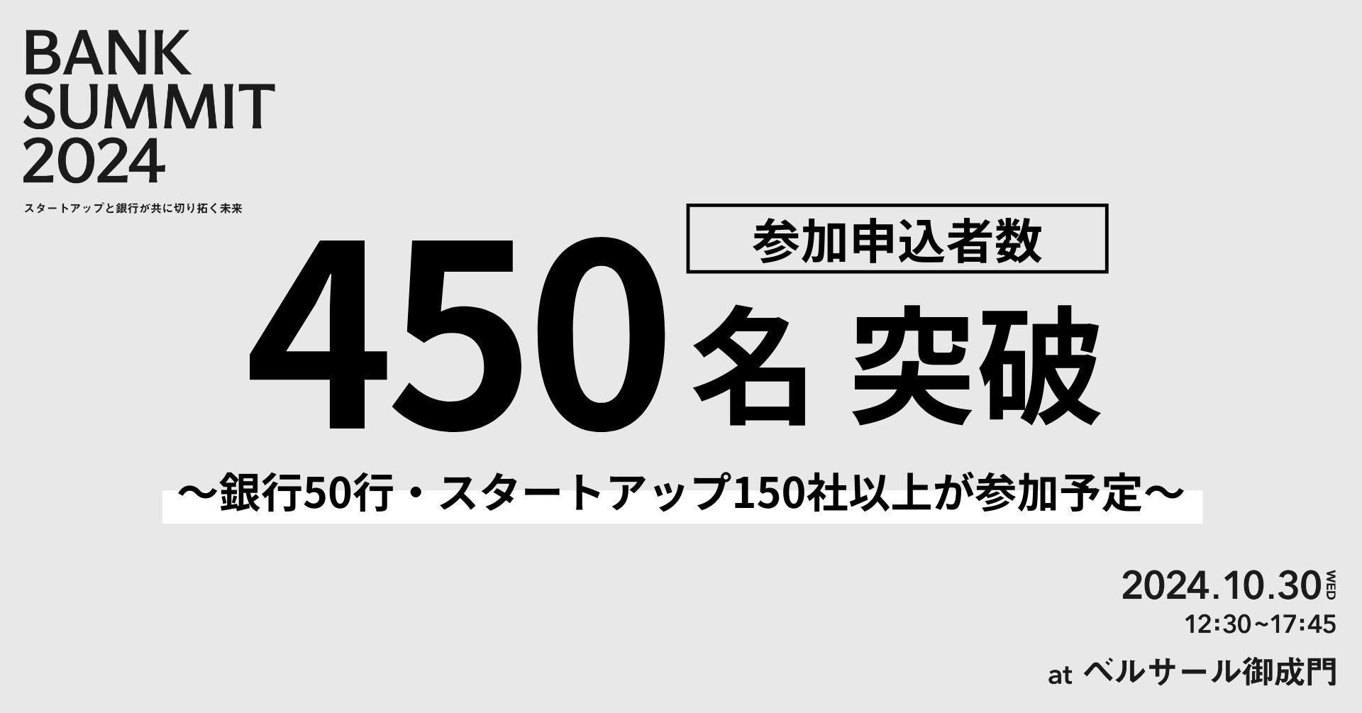 シード投資家「THE SEED」(本社:東京都渋谷区、代表:廣澤 太紀、以下「THE SEED」)は、2024年10月30日(水)にベルサール御成門タワーにて開催する「BANK SUMMIT 2024」の参加申込者数が当初想定の150名を大幅に越え、450名(銀行50行・スタートアップ150社)を突破したことをお知らせします。本イベントは、銀行とスタートアップが連携し新たな価値を創出することを目的としており、追加プログラムとして、4社スタートアップピッチを実施することも決定しました。
