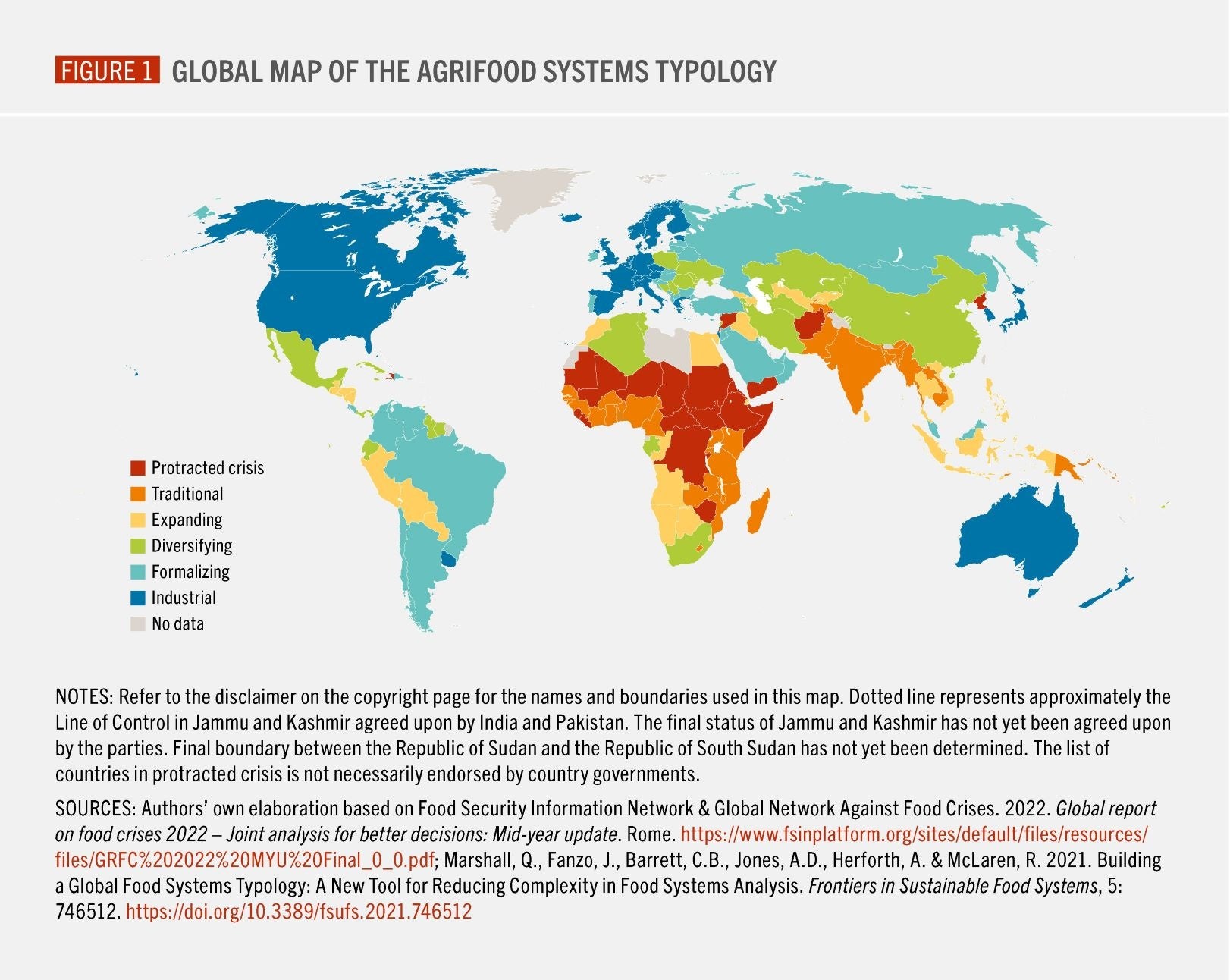 分析を容易にするため、この調査では、類型論を採用し、農業・食料システムを6つのグループ(「危機長期化システム」、「伝統的システム」、「拡大システム」、「多様化システム」、「形式化システム」、「工業化システム」)に分類している。この枠組みを用いることにより、各システムに固有の課題と機会を、的を絞って理解することができ、それぞれに合った政策や対応策を策定することが可能となる。