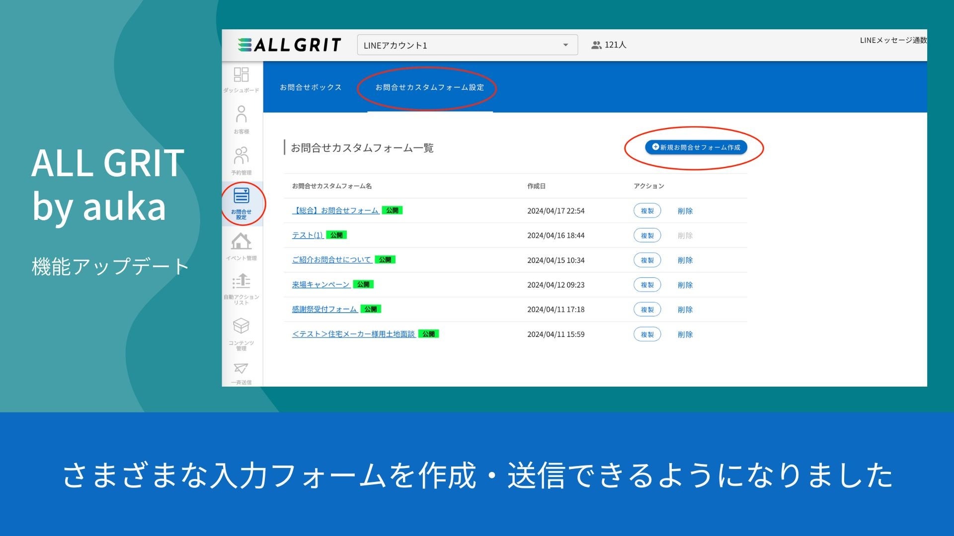 【機能追加:お問い合わせフォーム機能】ニーズに合わせた入力フォームで情報集約の効率化|住宅・不動産業界向けLINE運用ツール《ALL GRIT》