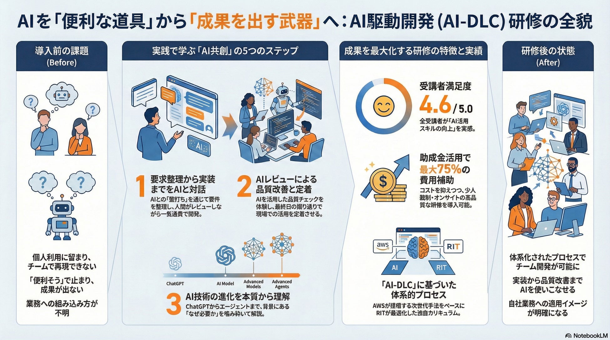 RITは今後、本研修を起点に、各社の開発テーマに合わせたカスタマイズ研修や、研修後のフォローアップ・伴走支援を提供していく予定です。生成AIを前提とした開発体制づくりを通じて、企業の事業開発スピードと競争力向上に貢献してまいります。