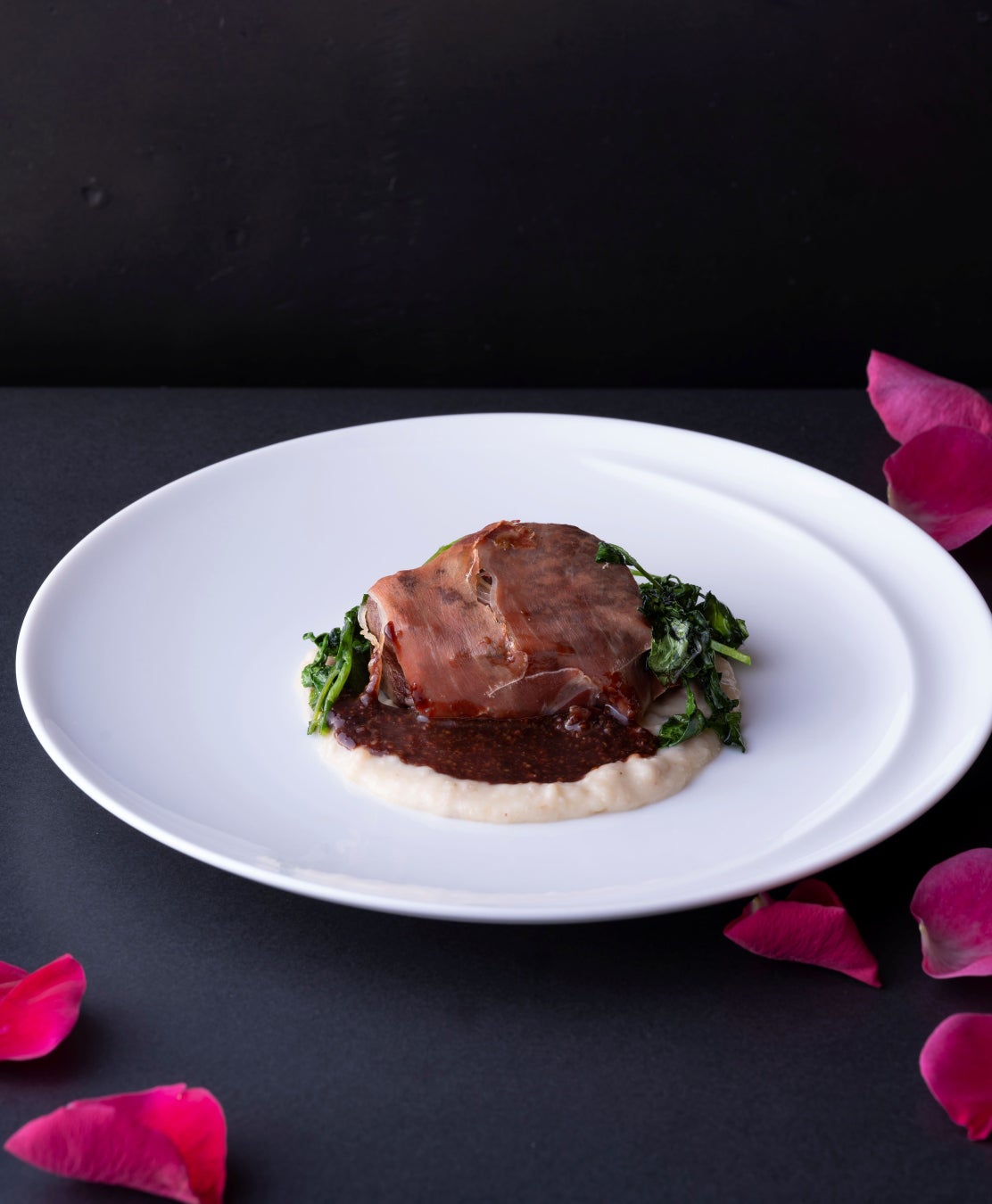日本産のビーフテンダーロインをセラーノハムで包み、ローストしたポテトのマッシュとグリルしたクレソンを添えて、粒マスタードソースで仕上げました。やわらかな和牛にハムの風味を加え、マッシュドポテトとクレソンの食感と香りをお楽しみいただく、バレンタインの王道のような一品です。