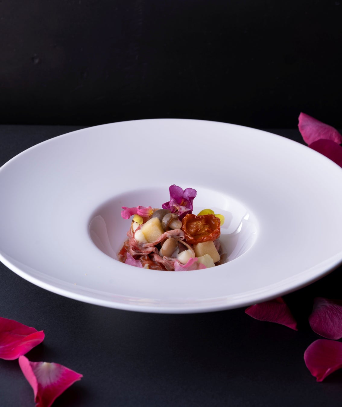 苺とトマトの赤が愛を象徴する一皿。美しい色合いと風味豊かな食材が調和した、コースの始まりにふさわしい一皿です。ローストした仔牛肉、リンゴのコンポート、ピクルスしたキノコといった食材の組み合わせと食感の違い、ストロベリービネガー、ガーリックアイオリでアクセントをつけた繊細な味わいをお楽しみください。