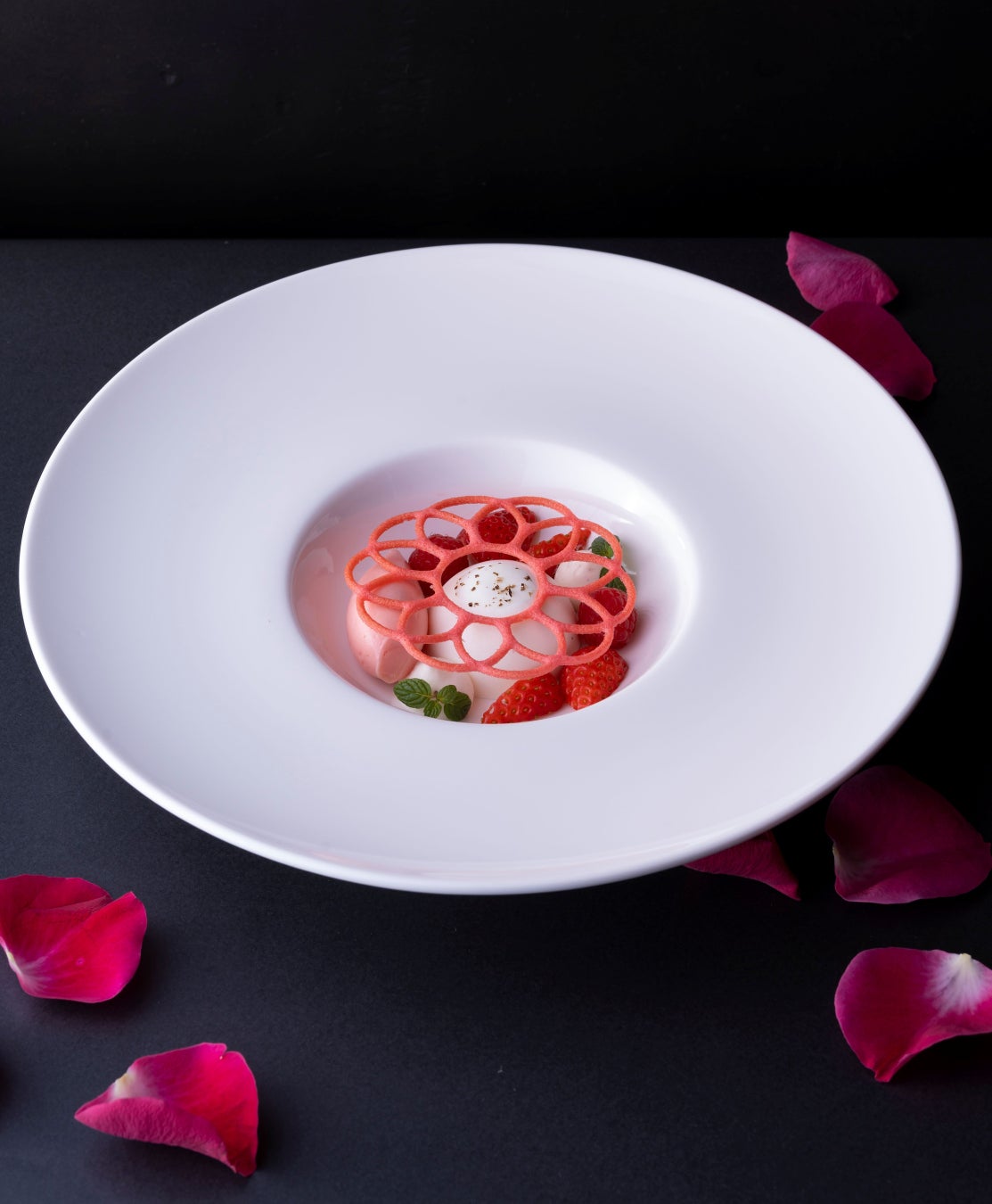 苺とクリーミーなバニラ、ラズベリーソースが絶妙に組み合わさった「ストロベリー・フローティングアイランド」という名のデザートです。新鮮な苺、甘く魅惑的なトンカ豆の香りがついたポーチドエッグホワイトにアーモンドラズベリーのチュイルを飾りました。パーク ハイアット 東京 エグゼクティブ ペストリーシェフ、ジュリアン・ペリネ考案の繊細で美しいデザートです。