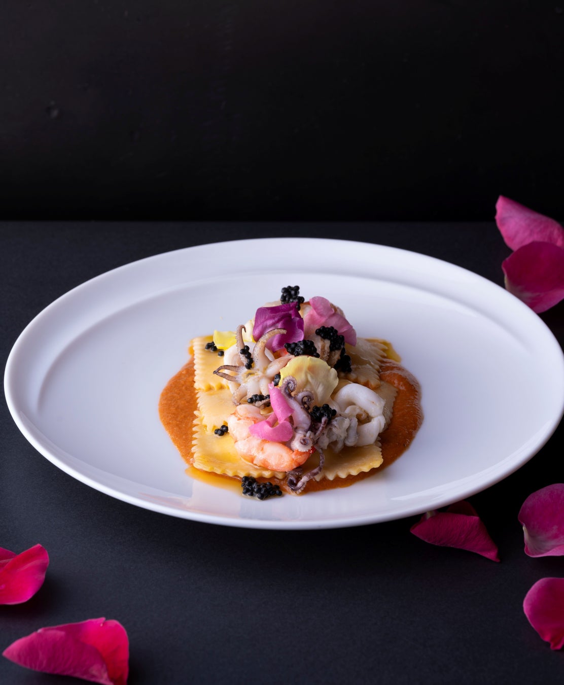 イタリア料理の定番、自家製のラヴィオリ。クリーミーなナポリ風プッタネスカソースの上にブッラータチーズを詰めたラビオリをのせ、海老、イカなどのシーフードとアヴルーガキャビアで彩りを添えました。バレンタインにぴったりな華やかな一皿です。