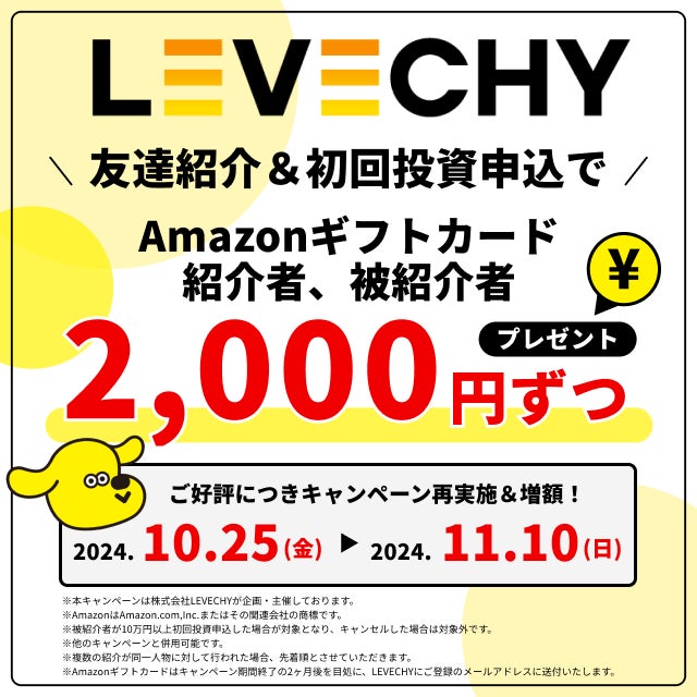 不動産クラウドファンディング「LEVECHY(レベチー)」を展開する株式会社LEVECHY(所在地:東京都港区赤坂、代表取締役:高 将司)は、2024年10月25日(金)11:00より、LEVECHYお友達紹介キャンペーンを再実施し、キャンペーン金額を期間限定で増額いたします。