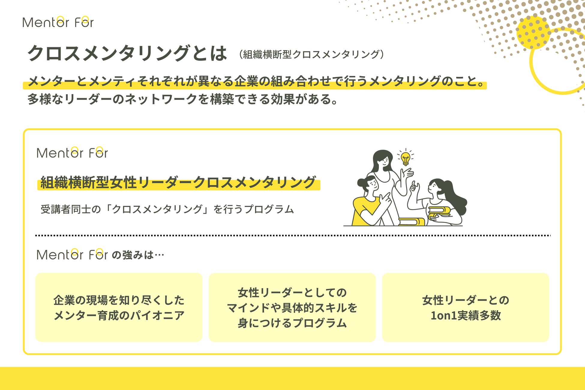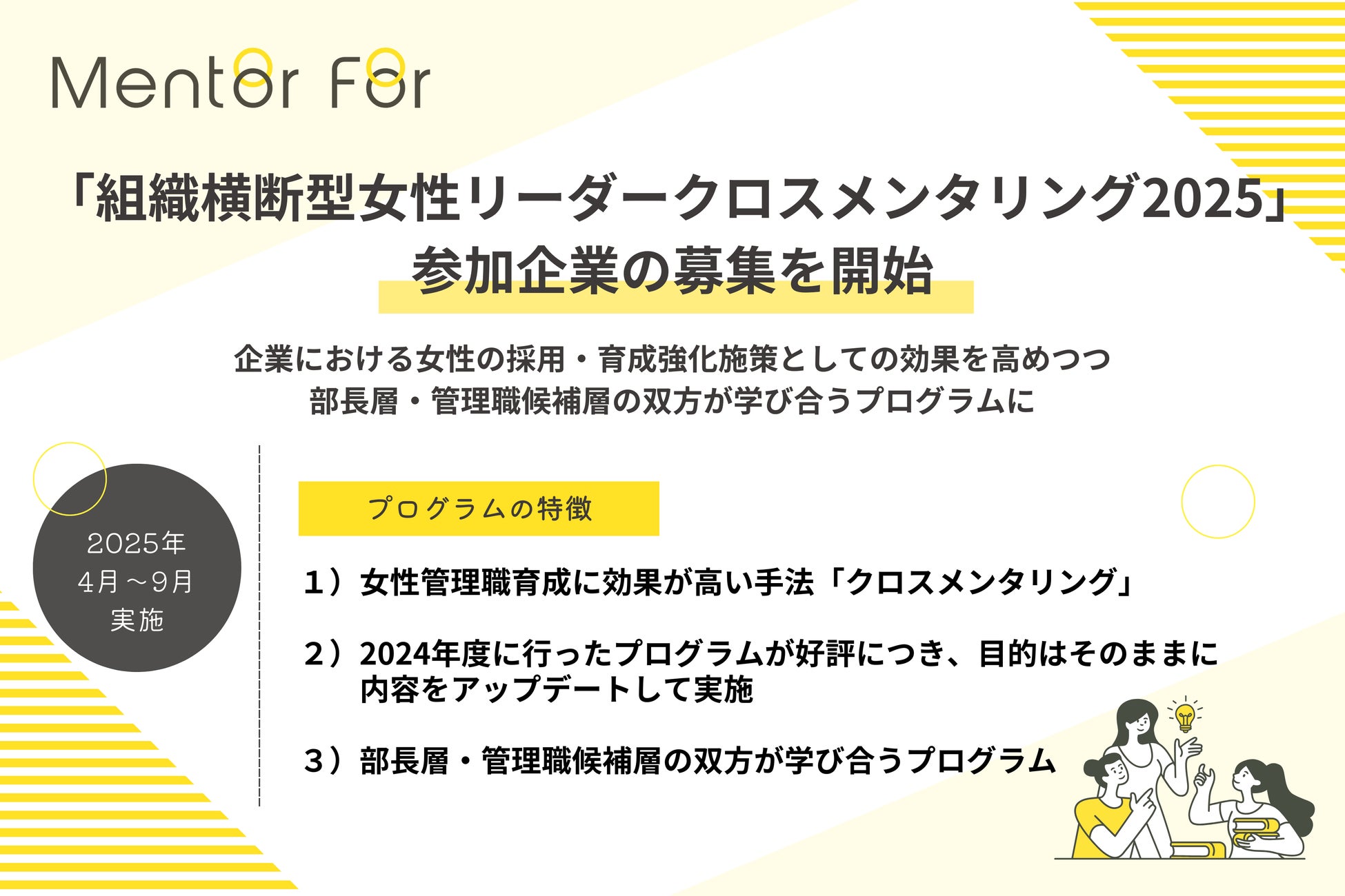 企業のDE&I(Diversity, Equity & Inclusion)・女性活躍推進を目的とした、社外メンターの育成・マッチング・社内メンター制度支援を提供する株式会社Mentor For(東京都渋谷区、代表取締役・池原真佐子、以下Mentor For)は、2025年度に開催するプログラム「組織横断型女性リーダークロスメンタリング」に参加する企業の募集を開始しました。