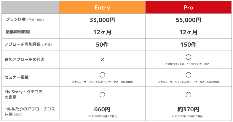 従来の料金体系のアプローチ単価は、約900円/件(基本料金内の最大アプローチ可能件数で算出)でしたが、新しい料金体系では、Entryプランは税込660円/件、Proプランは税込約370円/件(いずれも最大アプローチ可能件数で算出)でアプローチが可能になります。(※1)