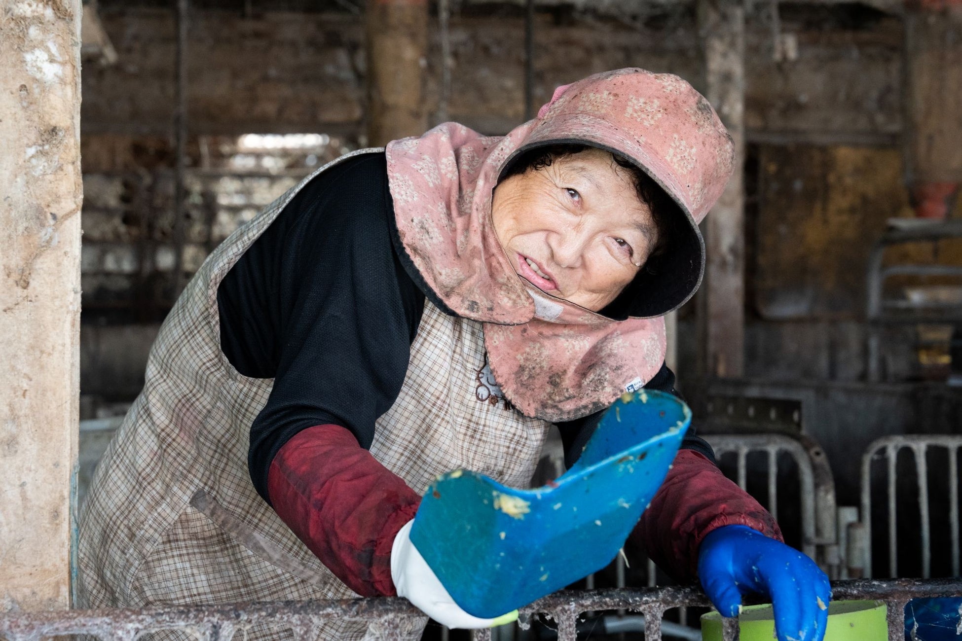 お産後の母豚・子豚と、離乳部屋にいる子豚たちに芋を与えるのはユウ子さん。