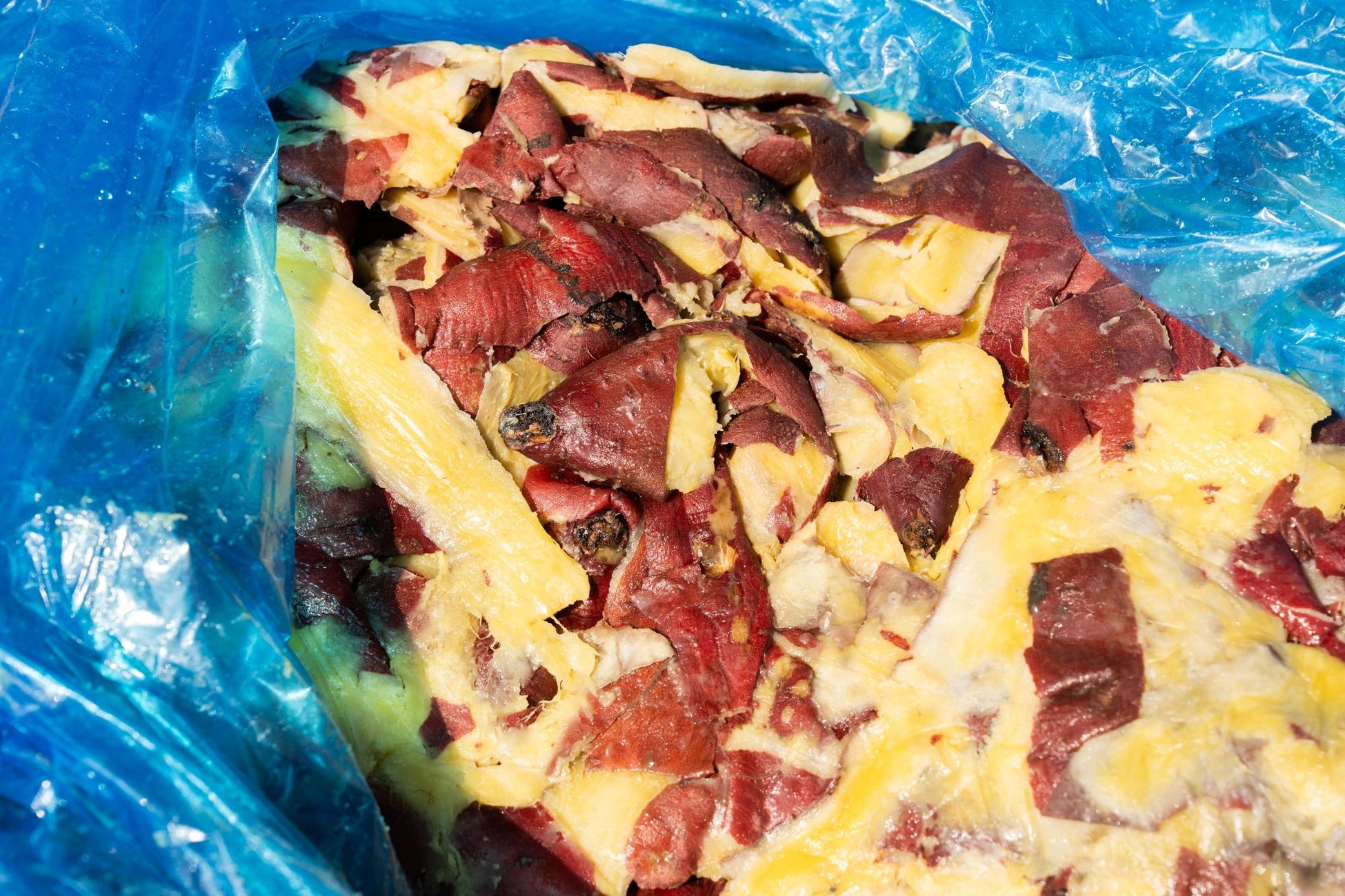この芋は食品会社・都食品から譲り受けたもの。規格外や端材となった芋を無駄にせず、母豚の授乳期や子豚のおやつに活用しています。紅はるか、シルクスイート、紫いもなど、季節によって種類が変わり、豚たちは夢中になって食べます。