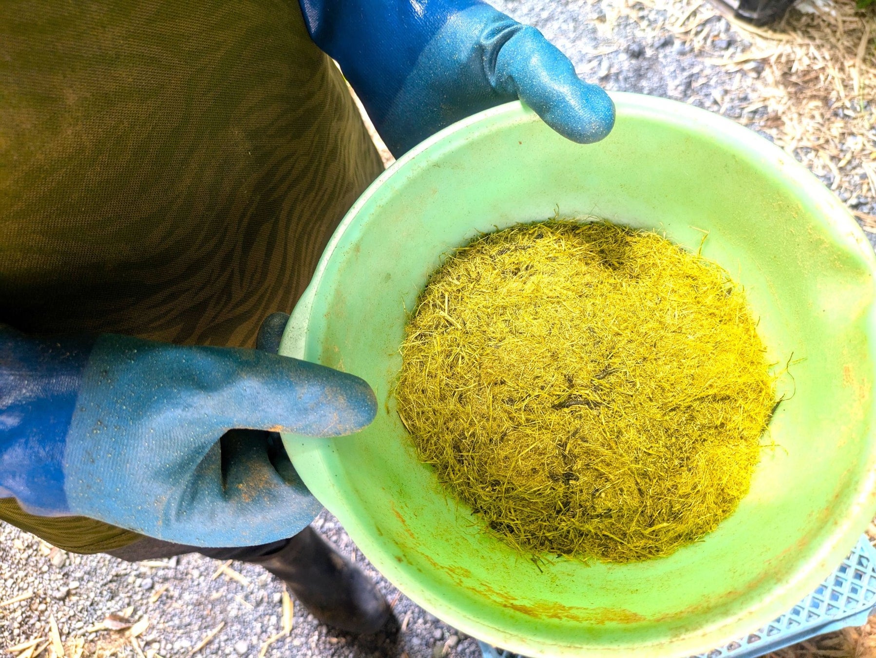 大崎町は緑茶の産地でもあり、茶農家から粉砕した茶葉の端材を譲り受けます。ビタミンが豊富で豚の栄養になるだけでなく、茶カテキンの効果で豚舎の臭いが大幅に軽減。化学的な薬品は一切使っていないのにもかかわらず、真夏の暑さのなか、不思議と強い臭いがないのです。